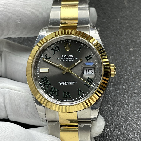 この時計の魅力は、何よりもその「オイスタースチール」と「エバーローズゴールド」の見事な融合にあります。ケースとブレスレットの中央リンクに、ロレックスが独自に開発した18ctエバーローズゴールドを採用。赤みを帯びた温かみのある輝きは、上品でありながらも親しみやすい印象を与えます。そして、側面と両端リンクには、非常に硬く腐食に強いオイスタースチールを使用。この二つの素材の組み合わせは、耐久性と高級感、さらには日常使いのしやすさという、一見相反する要素を見事に両立させています。文字盤は、光の加減で表情を変える「サンレース」仕上げのシルバー色。ローマ数字インデックスと、その時刻印ごとに一つずつ配されたゴールドの枠(ルーメット)が、洗練された立体感と深みを生み出しています。