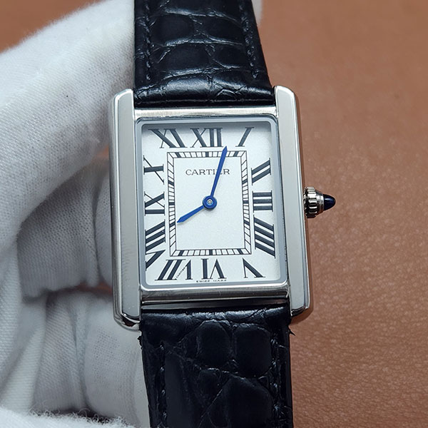 1、何よりもその不滅のデザインに魅力があります。1917年に誕生したタンクのデザインは、そのまま現代でも全く古さを感じさせません。WSTA0028は、シルバー色のサンレイ仕上げ文字盤にブルーの剣型針、ローマ数字とカルティエの秘密のサインが刻まれた「VII」の文字。ケースとベルトの艶消しと鏡面仕上げの絶妙な組み合わせが、フォーマルとカジュアルの狭間で、どんな装いにもそっと寄り添う品格を生み出します。24mm×31mmというコンパクトでスリムなケースサイズは、日本人の腕にもフィットしやすく、袖口にも引っかからない実用性を備えています。