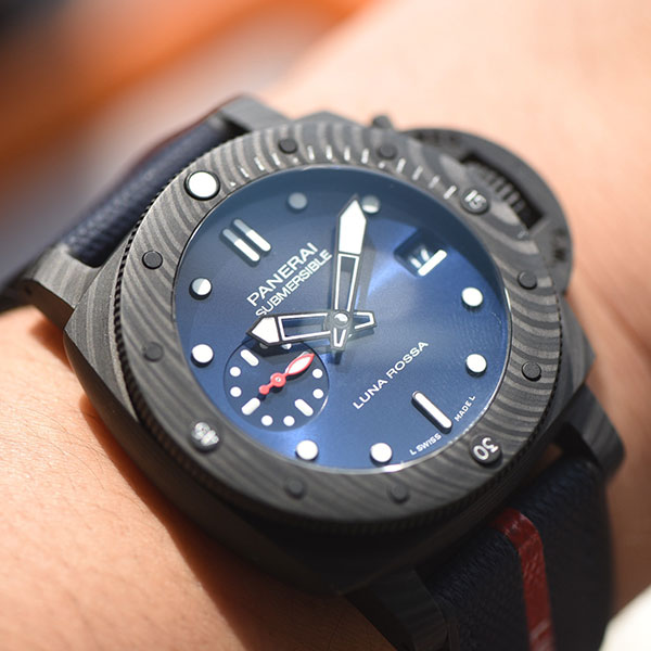 ストラップは、パネライ伝統の工具不要で交換可能なシステムを採用。付属のブルーのラバーストラップは、汗や水に強く、アクティブなシーンに最適です。一方、別売りのレザーストラップに交換すれば、一気に落ち着いた印象に。週末のアウトドアから平日のビジネスカジュアルまで、シーンに応じて表情を変えられる楽しさも魅力です。