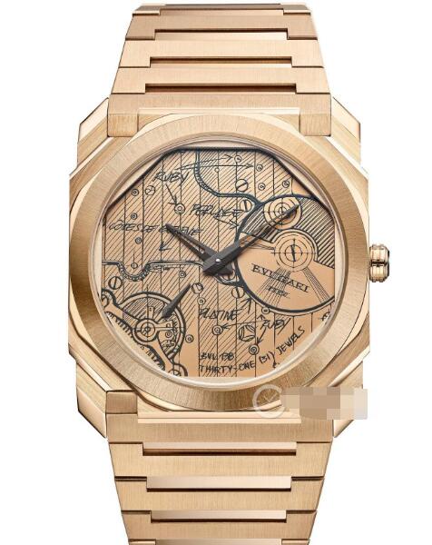 ムーブメントでは、この腕時計にはブルガリ独自の自動アップリンクムーブメントを採用し、時間の正確さと安定を保証しています。同時に、背面透底蓋を通して、ムーブメントの構造をはっきりと観測することができて、ジュネーブの波紋と真珠の紋様の2種類の磨き技術による精緻な美しさを鑑賞することができます。